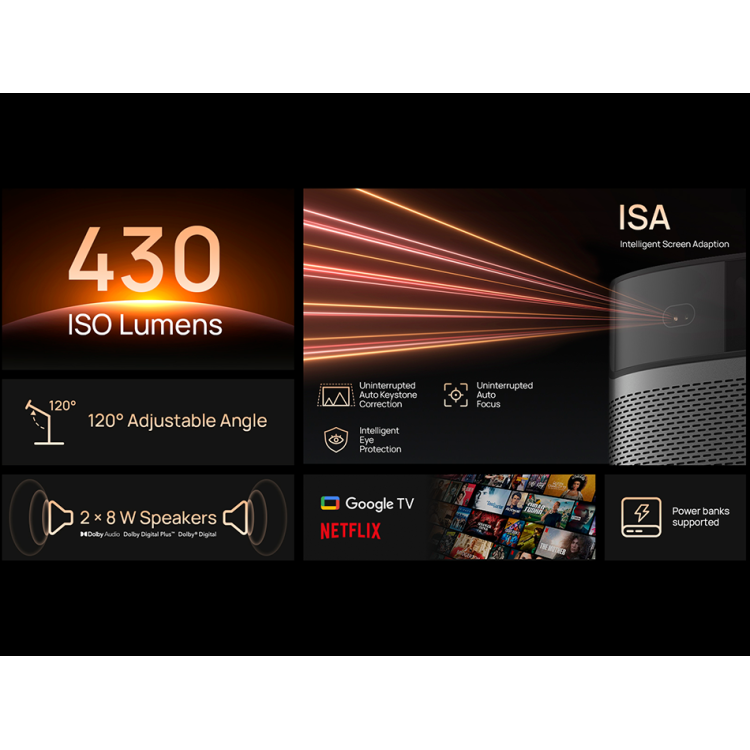 Xgimi MoGo 2 Pro GTV wyświetla obraz w rozdzielczości 1920x1080 px. Format obrazu to 16x9 i w takim formacie najlepiej wybrać ekran projekcyjny. Technologia odpowiedzialna za doskonałą jakość obrazu to DLP. Maksymalna jasność projektora Xgimi MoGo 2 Pro GTV to 430 ansi lumenów .